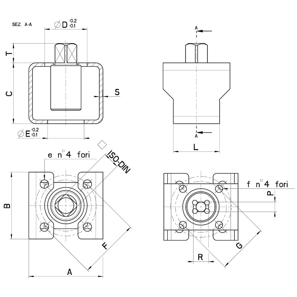 | MODELLO | DN Valvola | ISO 5211 | □ (ATTUATORE) | P x R | A | B | C | L | Ø D | Ø E | F | G | e | f | S | T | Kg. | CODICE AISI 304 | |