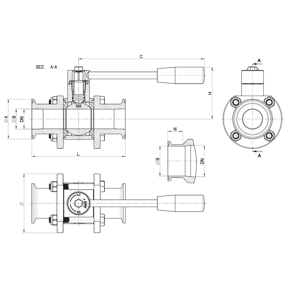 | CLAMP REIHE A DN | L | C | H | N | Ø | Ø A | Ø B | STAY BOLTS | Tightening bolts (Nm) | PN | Kg | CODE AISI 316L |