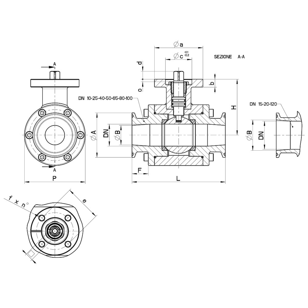 | CLAMP REIHE C | DN | L | Ø A | Ø B | F | H | Ø P | PN | Kg | ISO-DIN | Ø a | b | Ø c x o | □ | d | e | f x n°4 | viti | Nm * | CODICE AISI 316L |