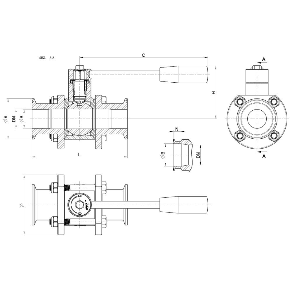 | CLAMP REIHNE B OD | DN | L | C | H | N | Ø | Ø A | Ø B | TIRANTI | SERRAGGIO TIRANTI (Nm) | PN | Kg | CODICE AISI 316L |